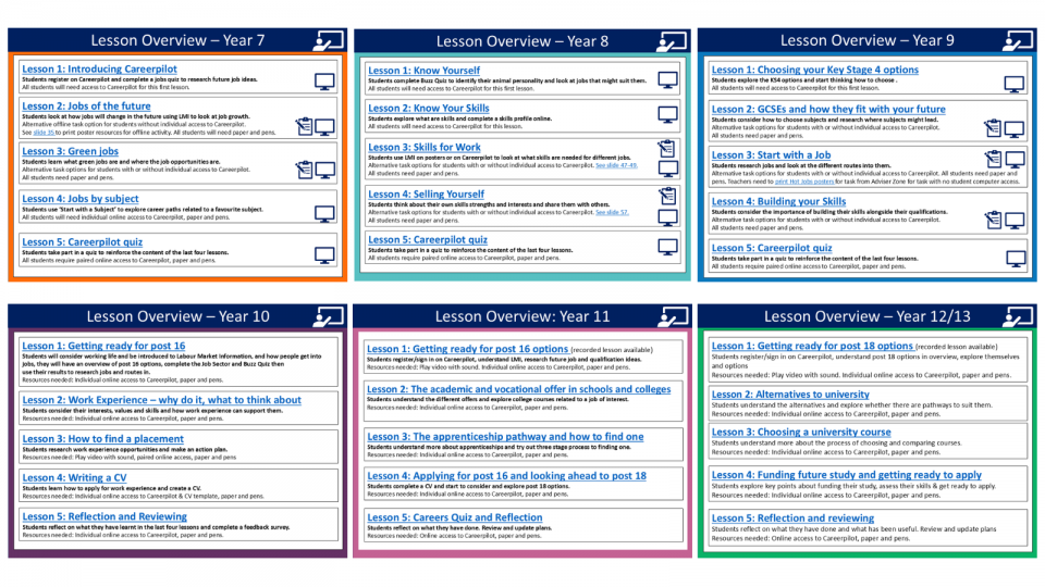 The Careerpilot Team - who are all are qualified career advisers and ex-teachers, have developed a 5 careers lessons for every year group - Y7 to Y12/13 - which aim to support students in: