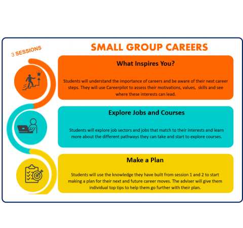 • Students will be in groups of 5 for a 50-60 minute lesson and have three sessions over a period of one to three months. The sessions will be delivered to align with the career choices students are exploring or making in that year. A member of school staff will be expected to support the sessions.