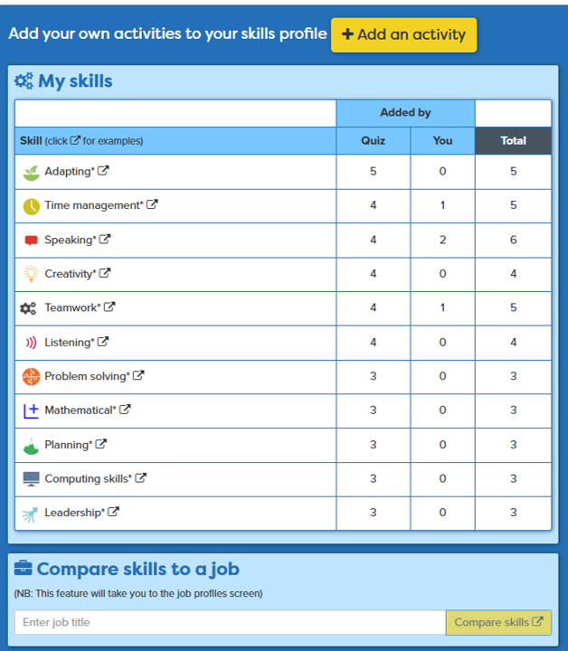 The Skills Profile - will ask what they have done in their life, learning or work so far (the students will need to be registered and signed in to complete the Skills Profile). For each question they tick, they will be shown which skills they have used when doing the activity. This builds up a 'Skills Profile'. They can then add any other examples they can think of (and add work experience as an activity when it has been completed).