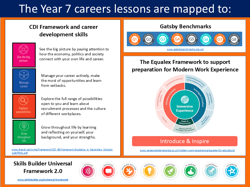 All lessons have been mapped to the CDI Framework with two outcomes per lesson. The lessons support the new Equalex framework for Modern Work Experience by preparing students for work experience and also support schools to help meet a number of the Gatsby Benchmarks.