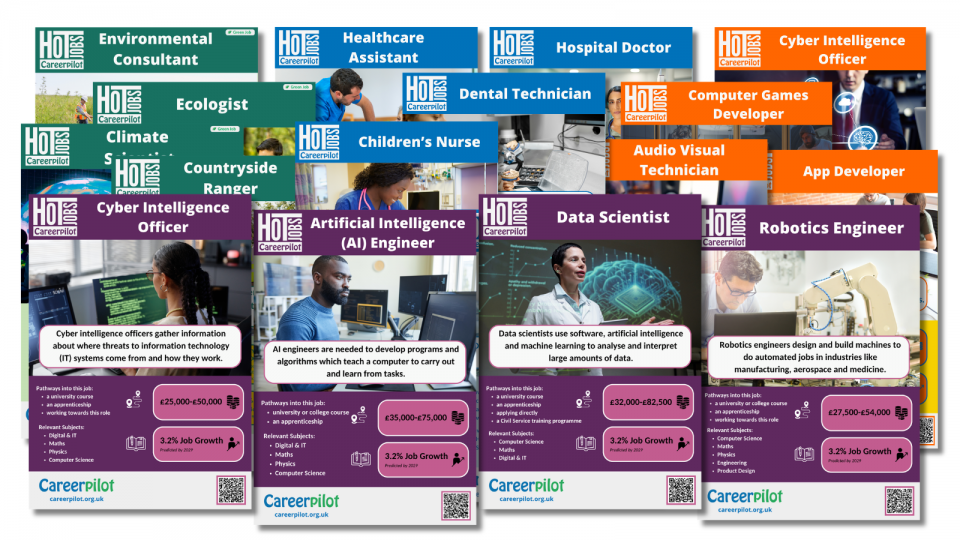 The Hot Jobs resources include posters, images and activities that use Labour Market Information (LMI) - updated twice a year - to support students to learn more about the job role, salary, predicted growth and the routes in, helping meet Gatsby Benchmark 2 - Learning from Labour Market Information.