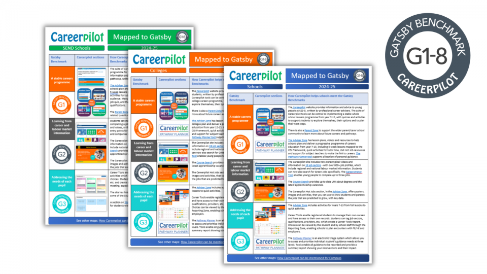 See how Careerpilot can help to you to meet all eight of the Gatsby Benchmarks with our maps showing the resources and tools you can use across all four areas of Careerpilot as part of your school or college's strategic careers plan.