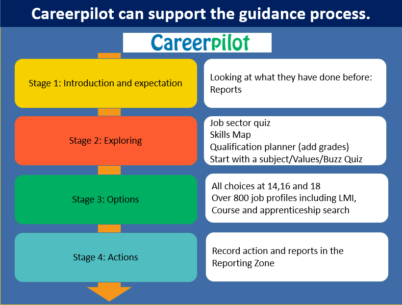 The Careerpilot platform can be used by Careers Advisers to support students at each stage of the personal guidance process, from using the student's Career Tools report as part of the pre-guidance planning, to supporting exploration of careers ideas, LMI and pathway options as part of the one-to-one session, and then recording and sharing actions in the Careerpilot Reporting Zone as a guidance follow up.