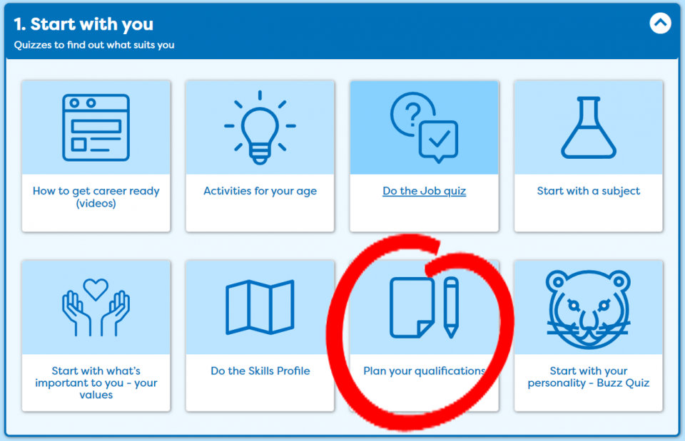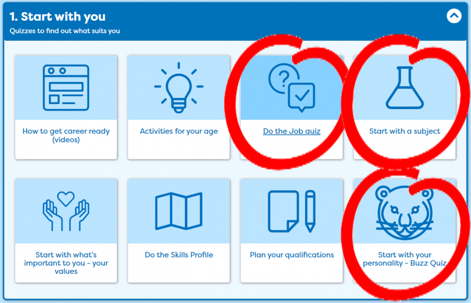 2. Do the start with your personality Buzz Quiz and /or the job sectors quiz (if not done before) to find out which job sectors might give you what you want or do 'start with a subject' to get job ideas related to a subject your like.. Explore My job sectors and look at job profiles or review your previous choices in 'My Job Sectors', if you have used this before.